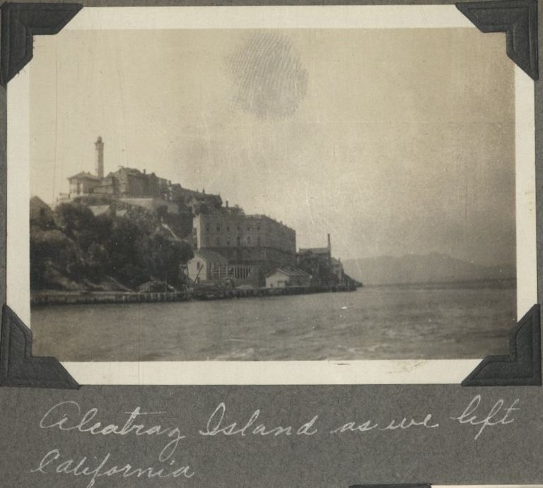 Subject: Troopships sailing from San Francisco all pass by Alcatraz Island. The small island was developed with facilities for a lighthouse, a military fortification, a military prison (1868), and a f
