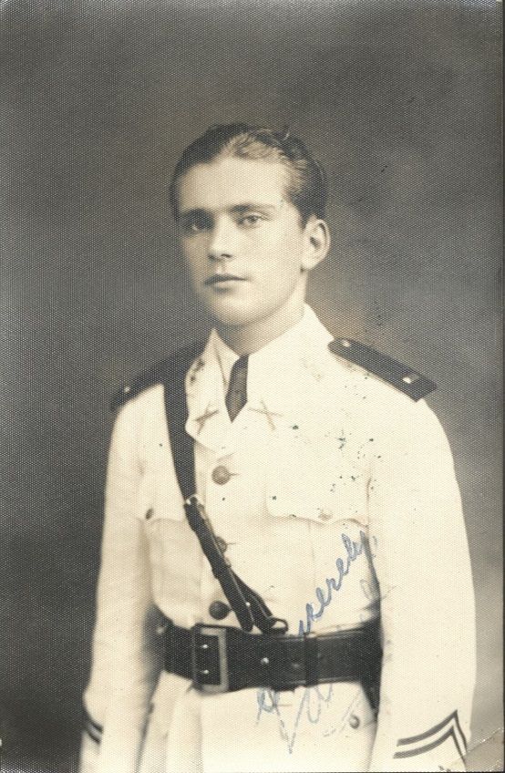 Subject: Formal studio portrait of Alfred Cerquella, one of Harry Jr.'s friends in Legaspi City, in military uniform. Written on back: "7/14/32. Dear Harry, Let this picture serve you as a