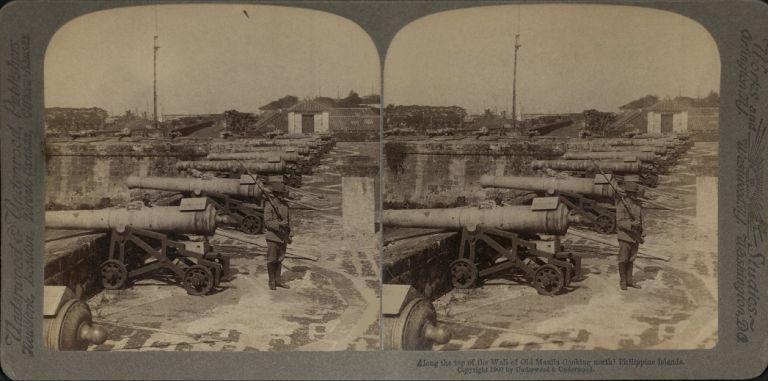 Underwood #U295. Soldier stands guard duty on walls of Intramuros next to row of old cannons.