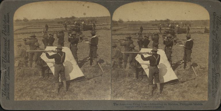 Underwood #U1005. U.S. soldiers stand in open fields, firing rifles, near Malolos, Philippines.