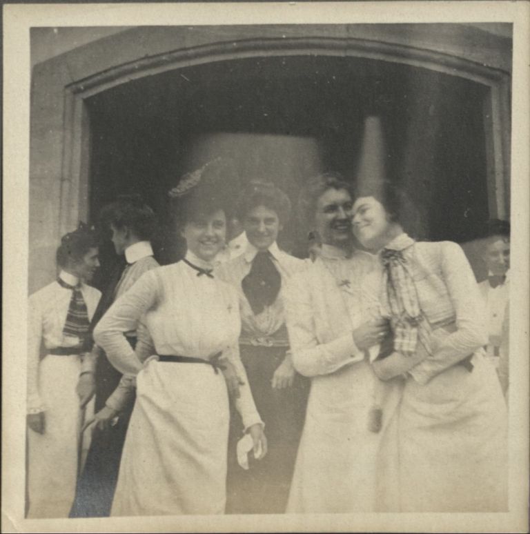 Subject: Young American women stand in a doorway, talking and laughing. See also OFI-002355.
