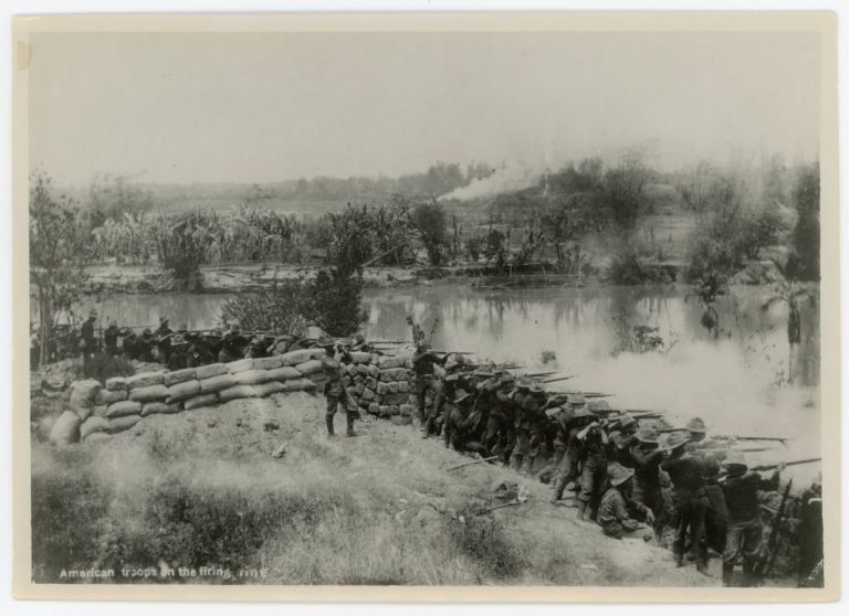 U.S. soldiers firing rifles from the defilade of stone and sandbag fortifications next to a river, most likely during the Philippine-American War. A later print from a ca. 1899-1902 image.