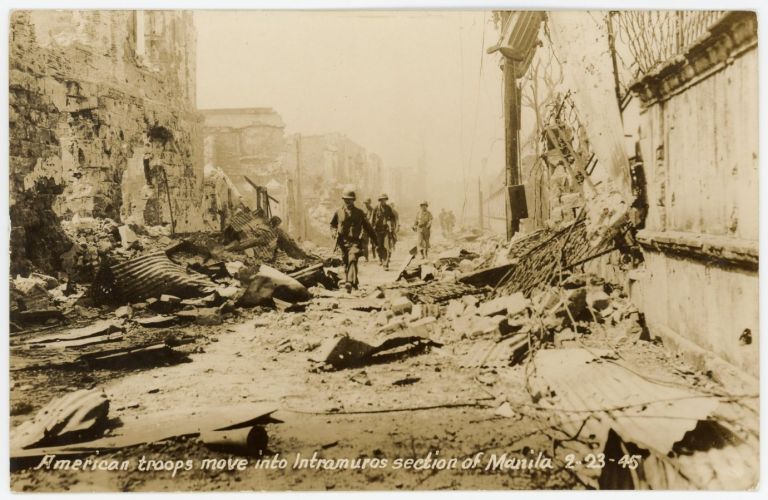 U.S. soldiers walk single-file down center of debris-clogged street and destroyed buildings in Intramuros during the Battle of Manila, Feb. 1945. Japanese forces retreated into Intramuros on the night of 19 February.