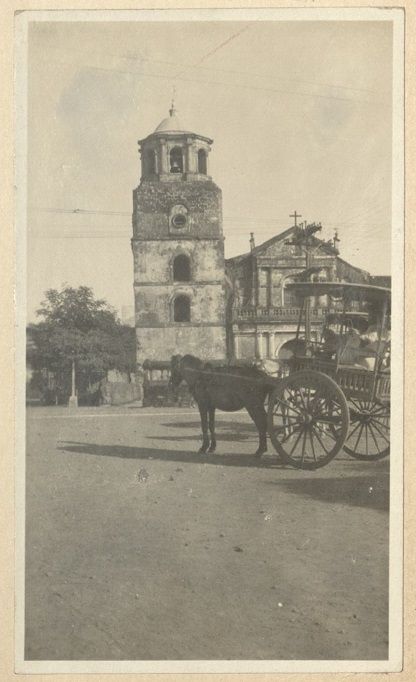 Subject: A horse and cart stand before Pasig Church near Manila. Pasig Cathedral or Immaculate Conception Cathedral is located at Plaza Rizal in Malinao, Pasig City. The present structur