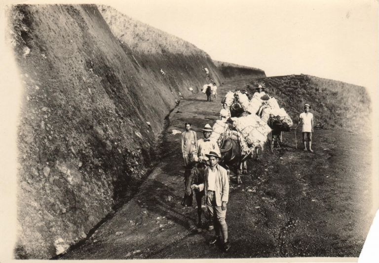 Animals heavily loaded with hemp [on a steep mountain road]. Kalasangay, Bukidnon Province.