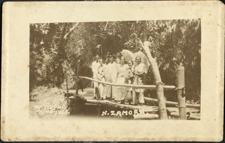 Subject: Group of 8 unidentified Filipino men and women pose outdoors in traditional dress, standing on wooden footbridge in Antipolo.
