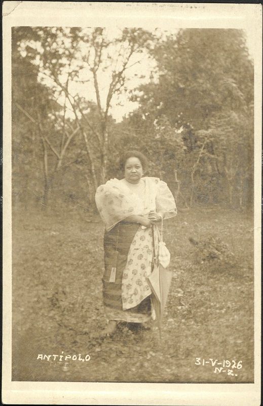 Subject: Portrait of an unidentified Filipina in traditional dress holding umbrella, standing in field before trees in Antipolo.