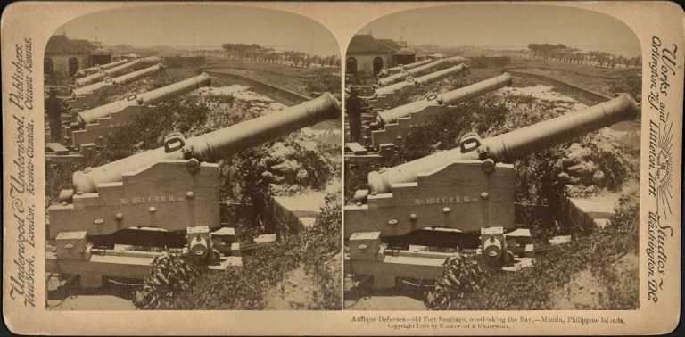 Underwood #U1155. Row of old Spanish cannons on top of parapeted wall of Fort Santiago, Manila, Philippines.