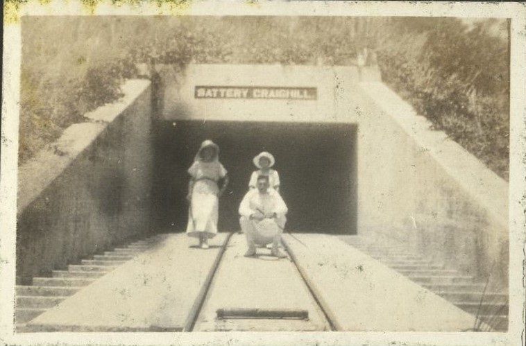 April 18, 1920. With Lt. & Mrs. Haggelstein at Caballo [Island]. Capt. Adams, C.O. [Girls at entrance to Battery Craighill, Fort Hughes].