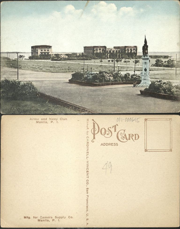 View from Luneta across Burnham Green to Elks Club and Army-Navy Club in Ermita; Legaspi and Urdeneta monument in foreground. See also OFI-006174 for a nearly identical view.