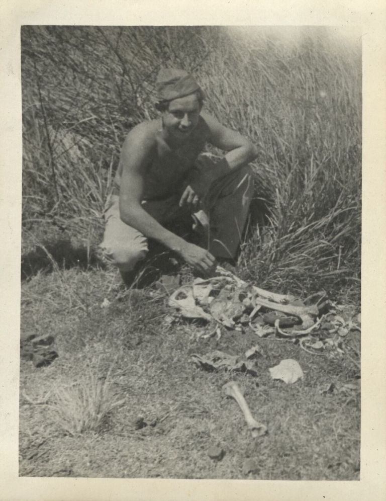 Subject: An unidentified U.S. soldier, an army buddy of the photographer. poses with bones, perhaps the remains of a Japanese soldier.