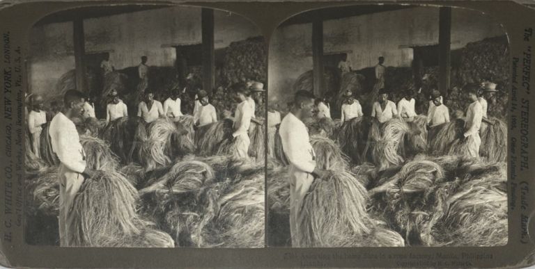 H. C. White #W3584. Filipinos sorting bales of hemp (abaca) fibers manually at a rope factory in Manila. See also OFI-004304.