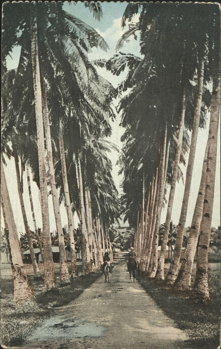 Subject: Two men on horseback on road in Jolo lined with coconut palm trees.