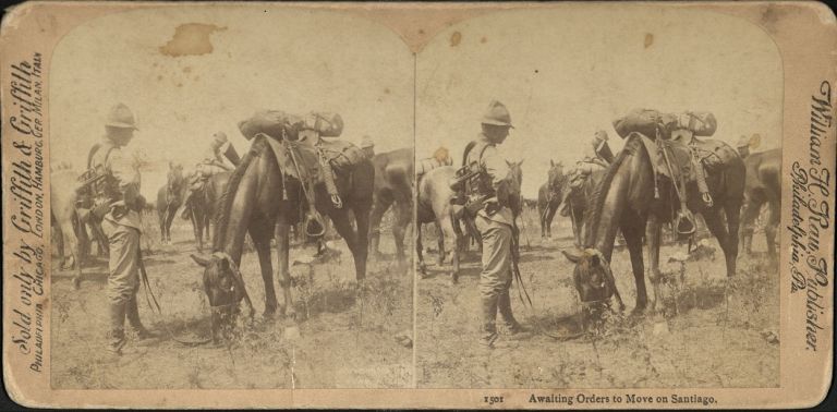 Griffith #F1501. U.S. Army cavalry soldiers stand before their horses near Santiago, Cuba, during the Spanish-American War.