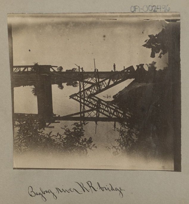 Subject: Railroad bridge blown up and collapsed in Bagbag River. Same incident as depicted in OFI-003431 but a different view. "Railroad bridge over the Bagbag River was damaged by the Filipino insurg