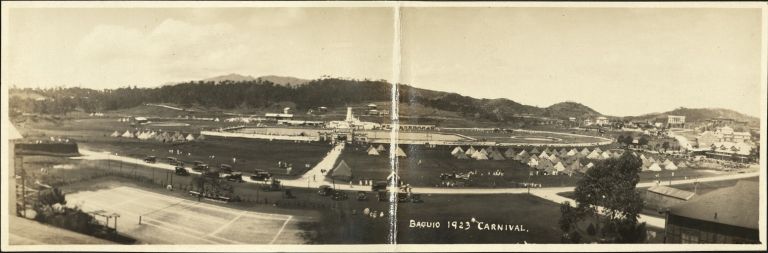 Panoramic view of downtown Baguio during the 1923 carnival. Burham Park and the lagoon center with grandstand far center; to the far right is the market.