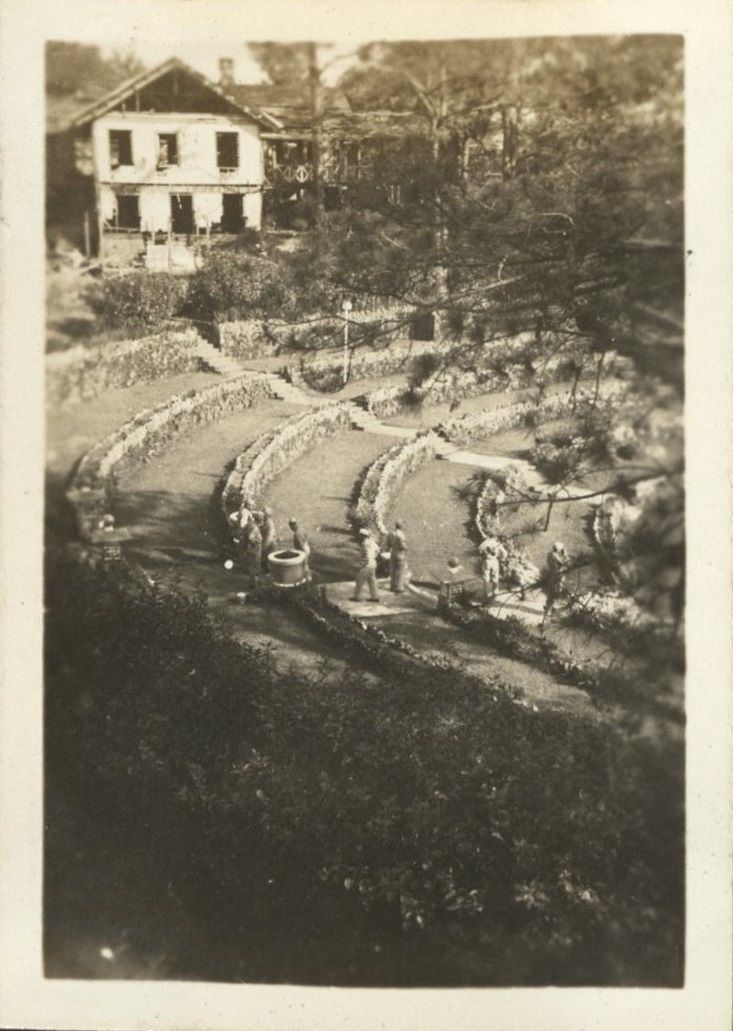 Subject: The terraced gardens of the Bell Amphitheater, built 1913, on the grounds of Camp John Hay in Baguio. Unlike the more typical view (ROJR-000058) this does not show the gazebo or ringed-tree s