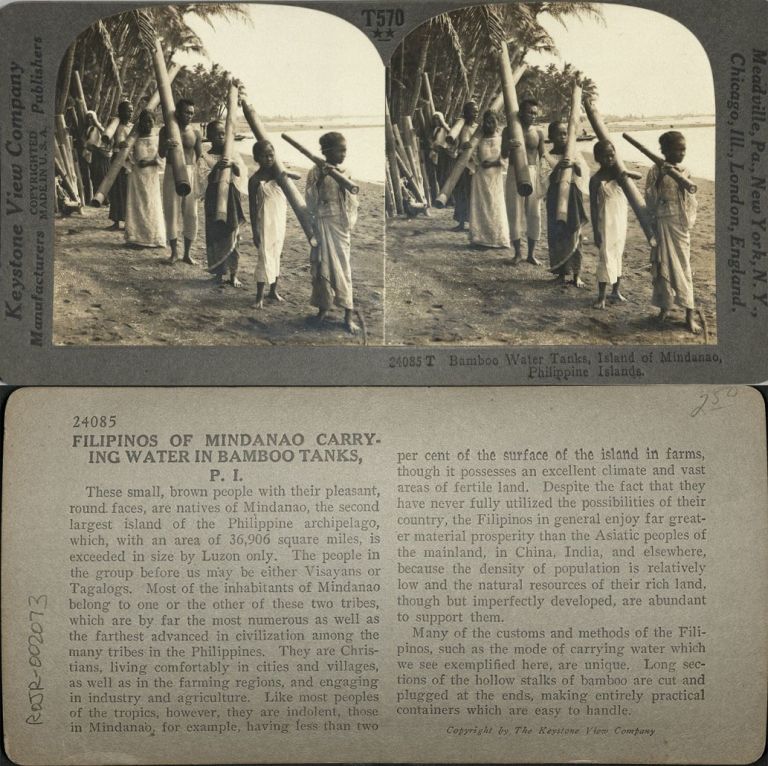 Keystone #K24085. Filipinos transport water in long, hollow bamboo tubes carried on their shoulders along seashore in Mindanao.