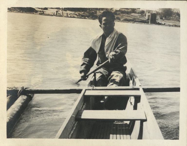 Subject: A Filipino boatman paddles and steers his banca (a narrow outrigger canoe) on the Pasig River.