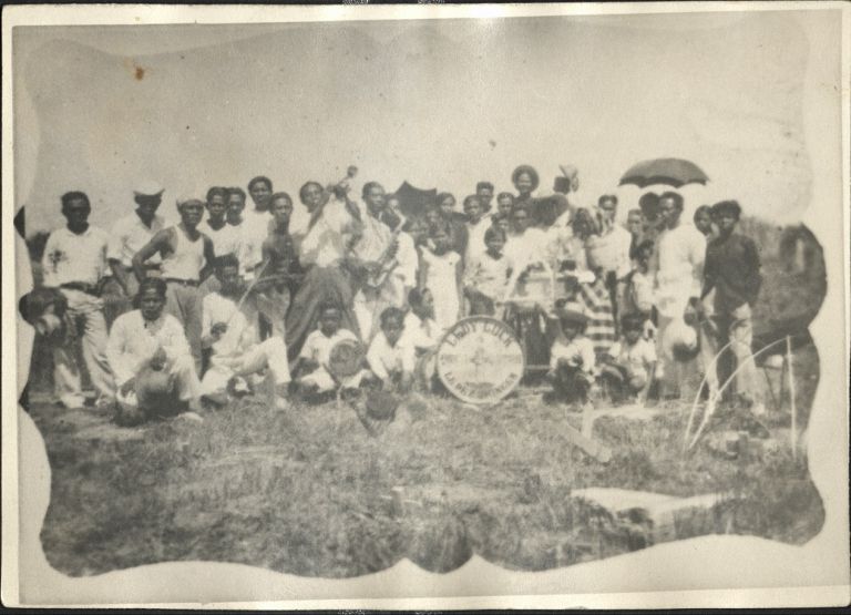 Subject: Group photo of large band with their instruments and their families. Drum says they are called "Lady Luck" from La Paz, Umingan, Pangasinan, Philippines. Apparently a photograph of a photogra
