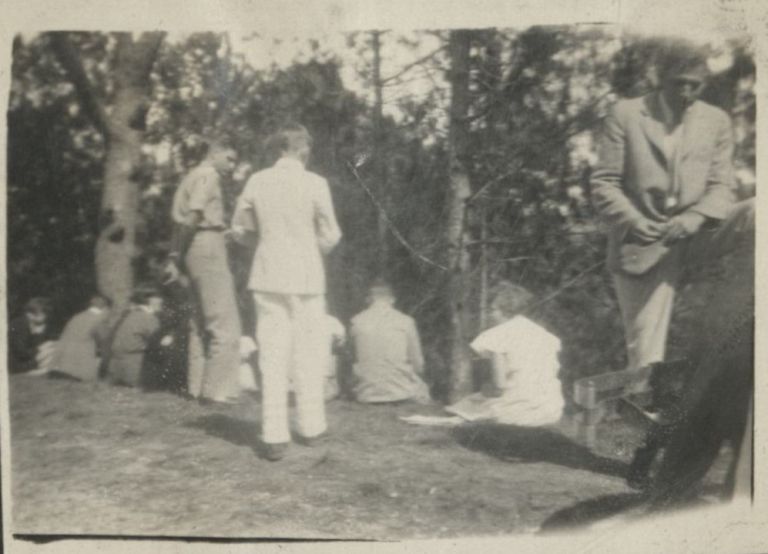 Subject: This bank over a pine-filled gully on the Brent School grounds must have been a popular hangout for students on breaks, as it features frequently in young Harry Hawkins' photographs of classm