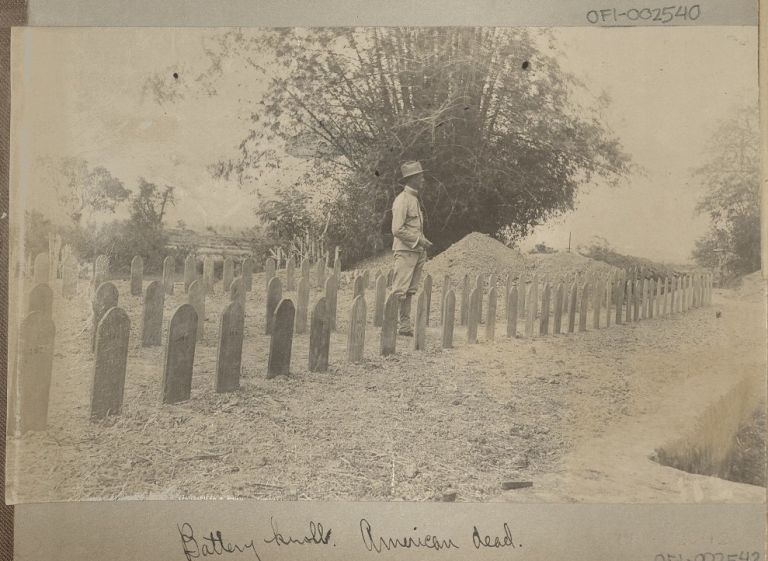 Subject: Cemetery of American war dead in Caloocan, north of Manila. "Nearly 300 soldiers lie buried there on a bleak mound, surrounded by rice fields, rough boards marking the graves, which are arr
