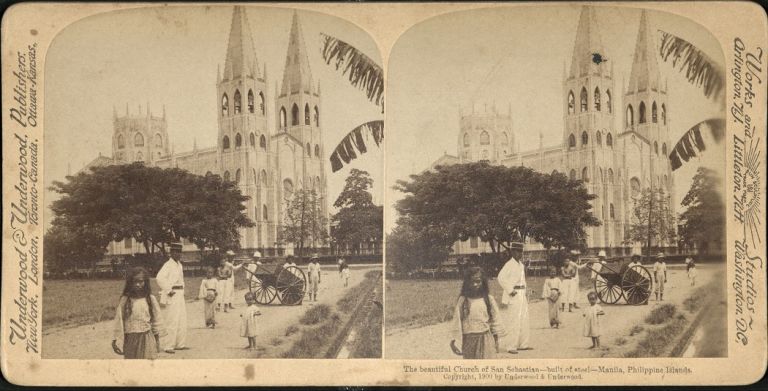 Underwood #U105b. People standing before imposing tall spires of San Sebastian Church in Manila.