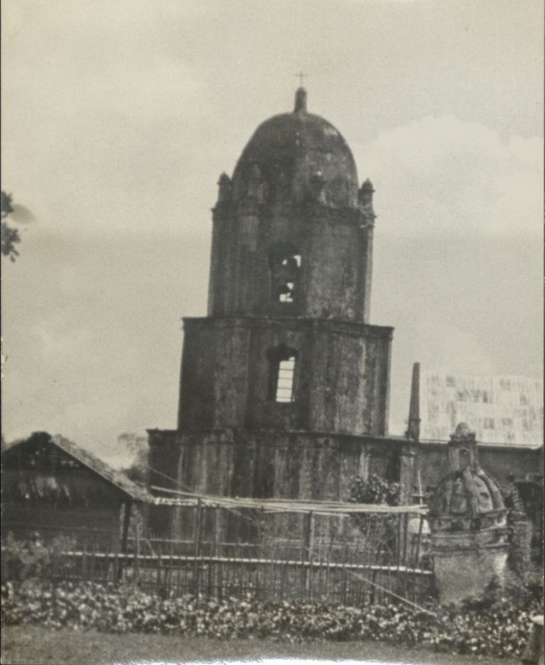 Subject: The church and bell tower of St. Michael the Archangel in Oas, Albay Province. The church was founded by Franciscan Missionaries in 1605; this structure, of brick and volcanic rock, dates fr