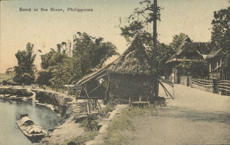 Subject: River village scene. Small nipa hut center, boat moored below at bend in river.