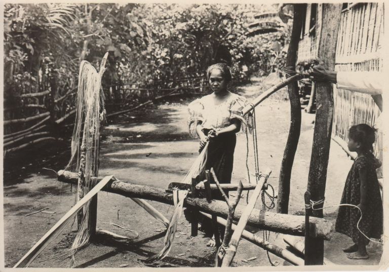 Subject: A Filipina pulls hemp strands through a device to clean and straighten the fibers.