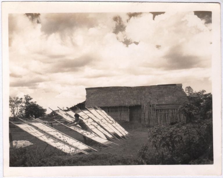 "Bijohn" [Bihon] means thin rice noodles (vermicelli) in Filipino. Here a man arranges the noodles on bamboo frames to dry in the sun. See also OFI-000214. Images in this album are from an American soldier in the U.S. Army 13th Air Force stationed at Clark Field.