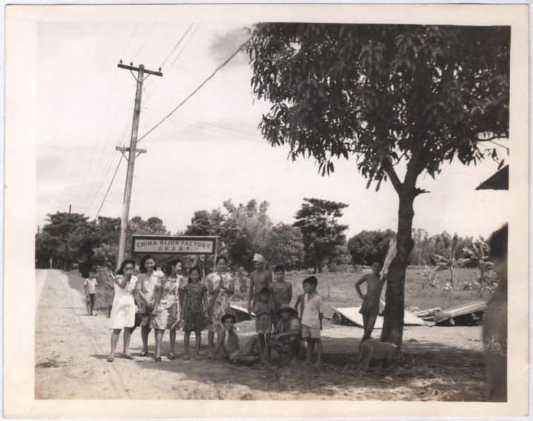 "Bijon" (Bihon) means thin rice noodles (vermicelli) in Filipino. Here a group of Filipinos, probably factory workers, stand at the road, perhaps waiting for transportation home. See also OFI-000213.