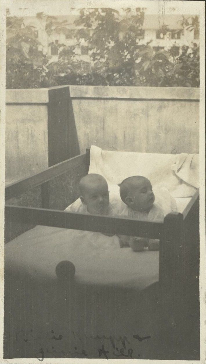 Subject: Two American babies share a crib, possibly at Fort Mills on Corregidor Island. Deciphering the caption involves eyestrain and guesswork. Is Billie Jr. the some of Billie the husband featured