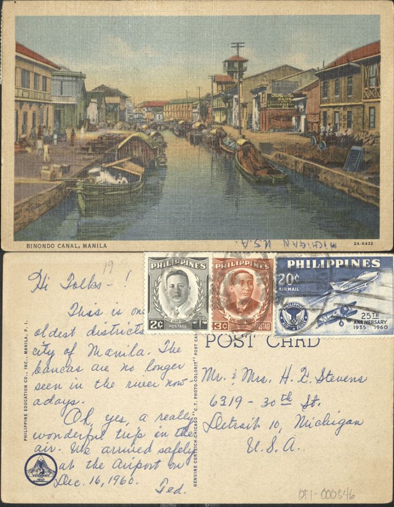 Cascos lining sides of Binondo Canal, commercial buildings either side. View from bridge.
