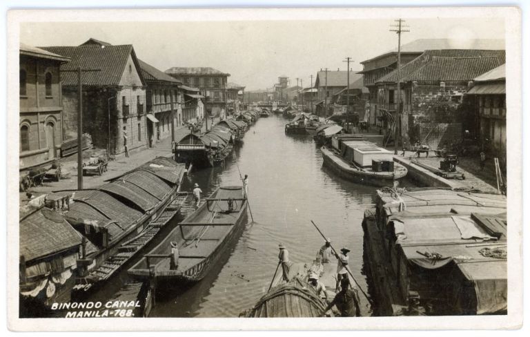 Freight barges (cascos) line the wharves of Binondo estero (canal) as seen from a bridge.