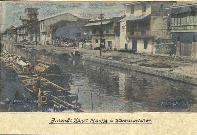 Subject: Binondo Canal view with boats on left, buildings on right.
