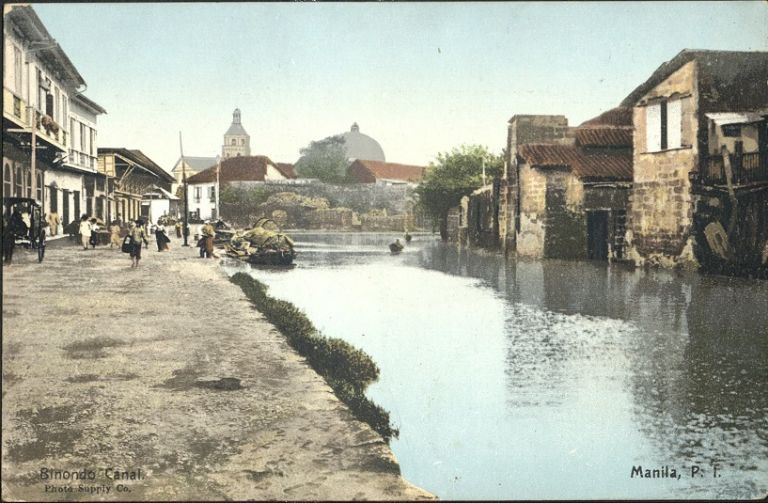 Subject: Binondo Canal with buildings, boats; Binondo church in distance.