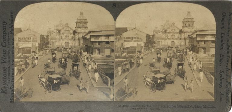 Keystone #K4551. Street scene of bridge, pedestrians, calesas, carts; commercial buildings and Binondo Church in distance.