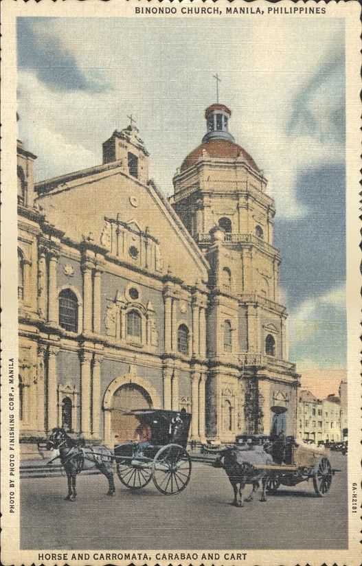 Subject: Binondo Church and bell tower in Manila with calesa, carabao and cart in front. Binondo Church is located in the Binondo district of Manila, fronting Plaza San Lorenzo Ruiz. The church was f