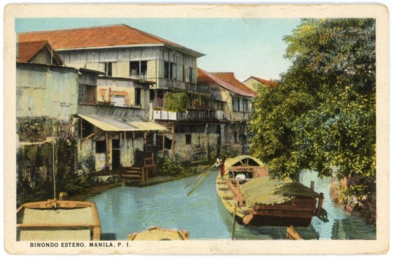 Cascos (freight barges) on a bend in Binondo Canal, commercial buildings to the left. View from bridge.
