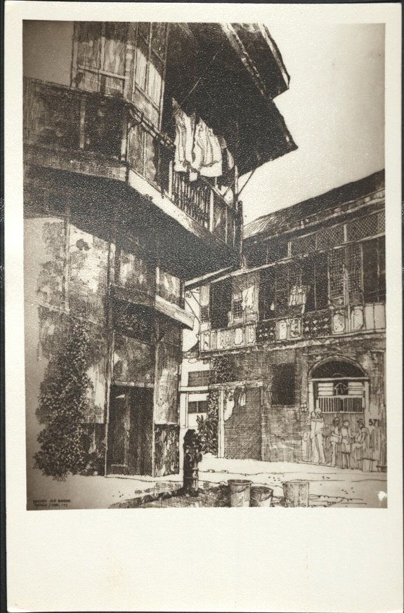 Subject: Street scene of large two-story traditional old houses in Binondo. Although not specified, these prints are similar to the postcards produced and sold b