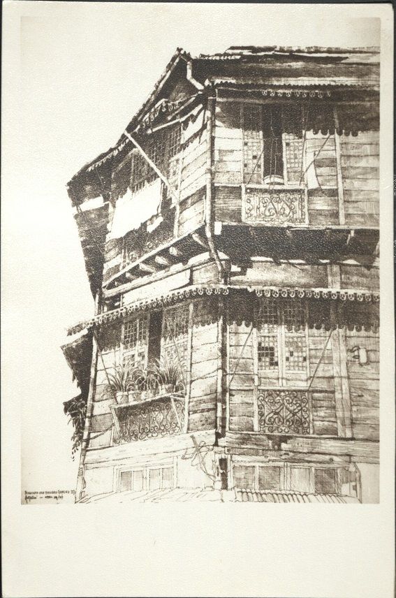 Subject: Street scene of large traditional old house in Binondo. Although not specified, these prints are similar to the postcards produced and sold by the Museo
