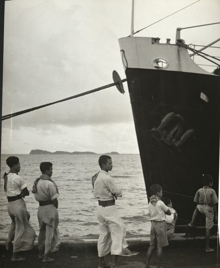 Subject: Sailors or dockworkers wait together with two young boys on the wharf of Lubang Island next to the bow of a large ship.