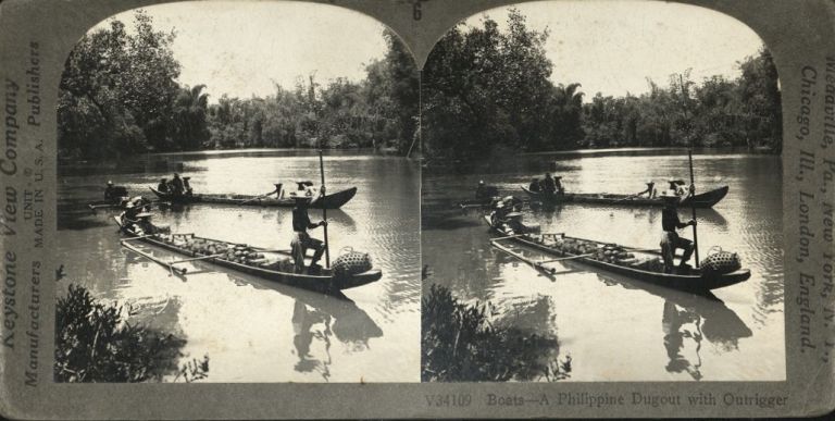 Keystone #K34109. Three outrigger canoes on a river in the Philippines, carrying coconuts.
