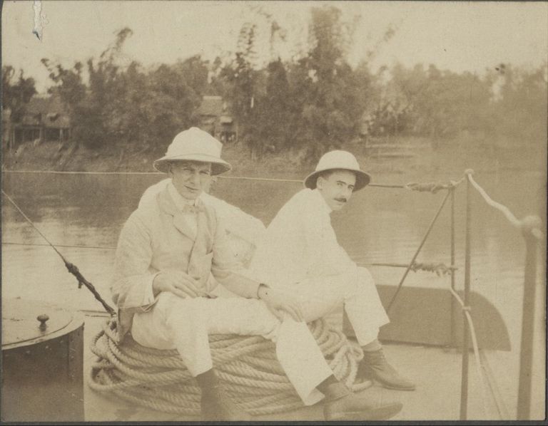 Subject: Two expatriate men in tropical white suits and pith helmets sit on a big coil of rope on a dock, likely on the Pasig River.