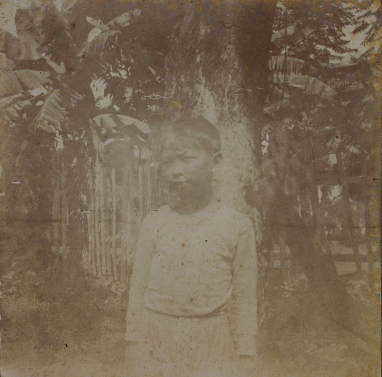 Subject: Bonito is the name of this boy or young man standing outdoors. The image is faded but he may have mestizo features. He was probably a local neighbor, cook, or helper around the cam