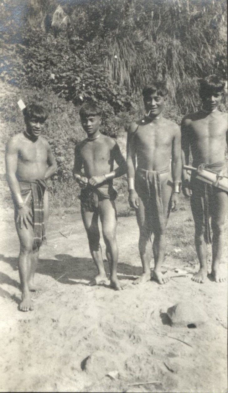Subject: Bontoc is the capital of Mountain Province and also the name given to the Igorot people from the area. Here four young Igorot men stand in traditional dress and weapons.