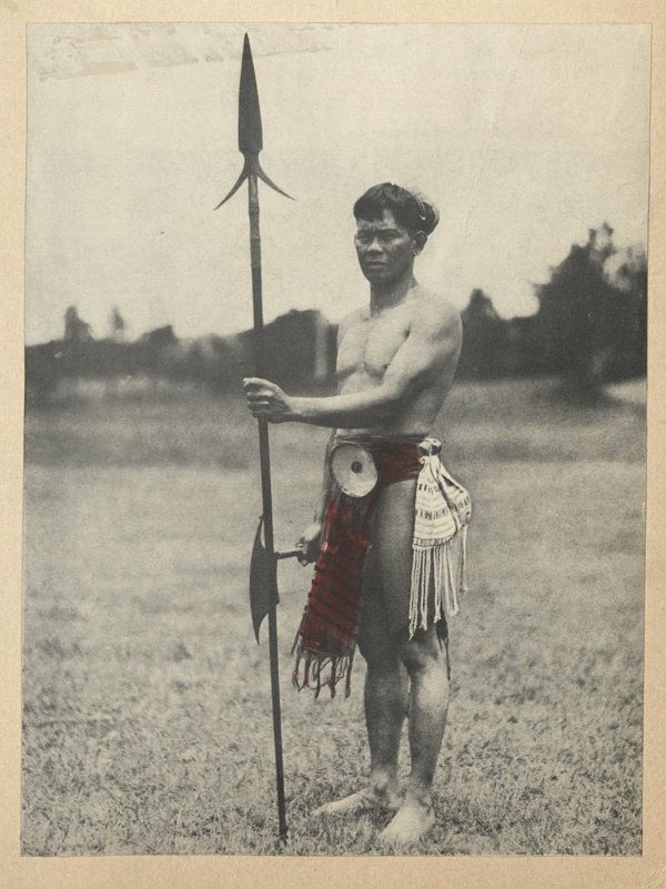 Subject: An Igorot man in traditional dress and holding a spear and axe poses in a field. Caption from the Sept. 1930 issue of National Geographic: "Pagan