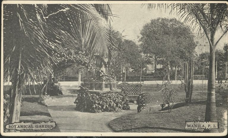 Subject: Benches, trees, and trellis in Mehan Botanical Gardens, Manila.