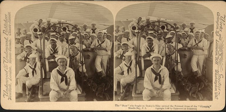 Underwood #U705. American sailors pose around big guns on the deck of Dewey's flagship "Olympia" in Manila Bay.